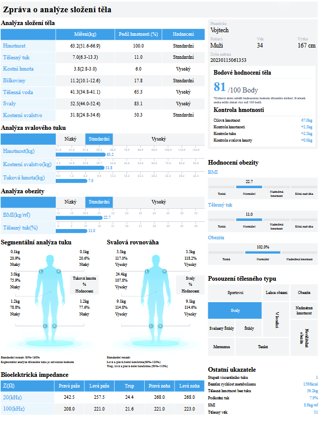 Takto společně vyhodnotíme analýzu složení těla. Je to výborný pomocník k tomu, abychom věděli na co se máme zaměřit. Vše ti podrobně vysvětlím a v rámci spolupráce to máš zdarma.